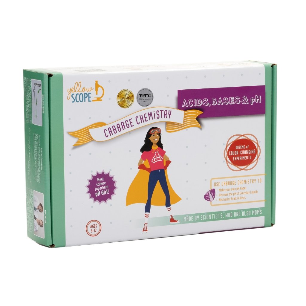 Did you know that red cabbage is a natural acid-base indicator? This award-winning chemistry kit comes with test tubes of concentrated red cabbage powder and all the supplies for dozens and dozens of color-changing experiments! With superhero pH Girl as their guide, kids will have a blast making their own pH paper and discovering the pH of everyday acids and bases like detergent, baking soda and lemon juice.
